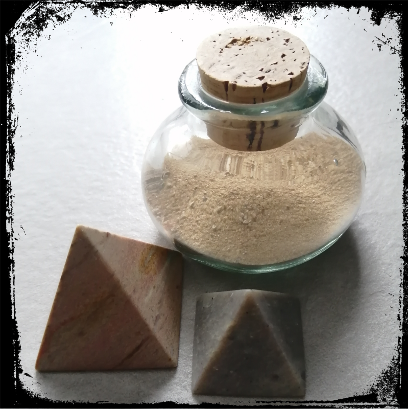 Dit potje met zand, dat staat al vele jaren in mijn kast. Verzameld (ondanks de strenge bewaker) bij de Sfinx in Gizeh, toen ik daar 1 dag was. En pyramides, daar had ik ook 'iets' mee.